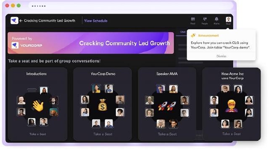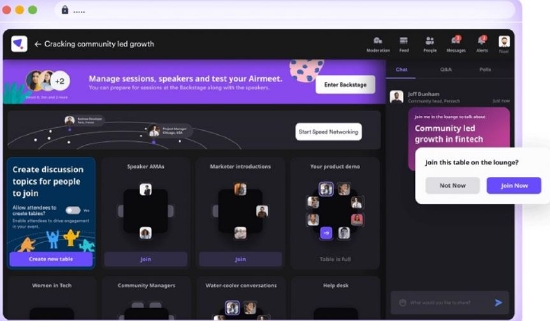 Airmeet提供两种产品类型:“会议”和“社交网络研讨会”,使企业和组织能够打破界限、建立关系并解锁新的收入来源。Airmeet不仅使企业能够同时与现有客户、潜在客户建立联系,并提供了展台设置、赞助商广告、活动分析等后台功能。Airmeet得到了用户社区的大力支持和好评,他们的NPS和G2 Crowd评级在业内名列前茅。