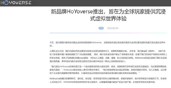 2月14日米哈游公布旗下全新品牌HoYoverse,该品牌旨在通过各类娱乐服务为全球玩家创造和传递沉浸式虚拟世界体验,打造一个“由内容驱动的宏大虚拟世界”,游戏、动画和其它多种娱乐类型在这里融合,为玩家提供高自由度和沉浸感。